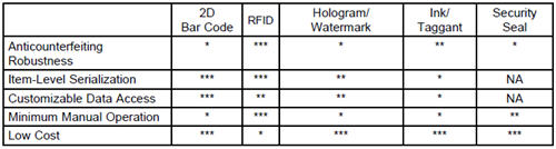 How do existing anticounterfeiting technologies satisfy the five attributes outlined above? Table 1 depicts my own opinion on a few leading technologies. Not surprisingly, 2D bar code and RFID are two favorites. RFID was regarded as holding a great promise on drug supply chain management a few years ago. The FDA even announced in 2005 (http://www.fda.gov/oc/initiatives/counterfeit/update2005. html) that it hoped the pharmaceutical sector would, by 2006, be using RFID tags at item level on all drugs likely to be counterfeited. Many in the pharmaceutical industry also agree that RFID would be valuable for supply-chain security. However, several issues have prevented the widespread adoption of the RFID technology in the drug supply chain management (Lefebvre, Romero et al. 2011).