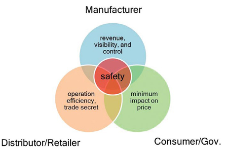 Current stakeholders to secure the drug supply chain can be categorized into three groups: the pharmaceutical companies as the manufacturers; the distributors and retail chain drug stores (retailers); and the consumers and the government. As shown in Figure 1, keeping the U.S. drugsupply chain safe is the only goal shared by all groups. However, that goal alone does not provide enough positive return on investment (ROI) to persuade all stakeholders to jump on the bandwagon. Other powerful incentives have to be offered to achieve this important goal.