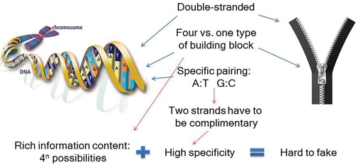 The strength of this DNA 2D Code technology is the specificity of DNA hybridization. As shown in Figure 2, DNA is like an advanced zipper: It is double-stranded, has four building blocks, and requires specific pairing of those building blocks. This design leads to high specificity through block pairing and rich-information content, which leads to its robustness against counterfeiting. Without knowing the sequences of DNAs used in a tag, it is nearly impossible for a counterfeiter to decipher the sequences — and then decode the tag.