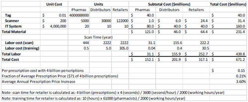 There are a few informative findings from this exercise. First, it turned out that the labor cost of scanning a code far outweighs the cost of the hardware and software. Second, the majority of the labor cost is on distributors/retailers, thus explaining their reluctance to adopt such a system. Third, the total cost is very high, requiring a compelling case in regard to ROI, to persuade the industry to move forward. Fourth, despite the high cost, when amortized per prescription, the cost of implementing such a system pales in comparison with average annual prescription price increases.