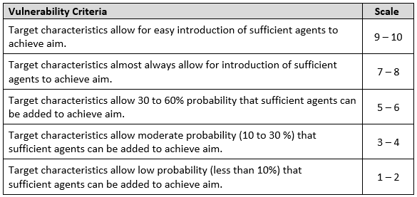 A measure of the ease with which threat agents can be introduced in quantities sufficient to achieve the attacker’s purpose once the target has been reached. Vulnerability is determined both by the characteristics of the target and the characteristics of the surrounding environment. It is also important to consider what interventions are already in place that might thwart an attack.