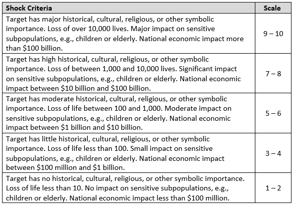 Shock is the final attribute considered in the methodology. Shock is the combined measure of the health, psychological, and collateral national economic impacts of a successful attack on the target system. Shock is considered on a national level. The psychological impact will be increased if there are a large number of deaths or the target has historical, cultural, religious, or other symbolic significance. Mass casualties are not required to achieve widespread economic loss or psychological damage. Collateral economic damage includes such items as decreased national economic activity, increased unemployment in collateral industries, etc. Psychological impact will be increased if victims are members of sensitive subpopulations such as children or the elderly.