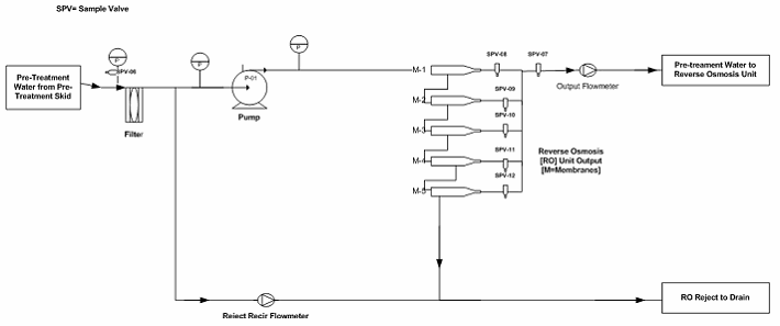 Figure 2: Example reverse osmosis (RO) unit to storage tank sampling points (Note: The drawing is intended to illustrate where the sampling points are located, not to reflect a complete detail of the RO Unit.)
