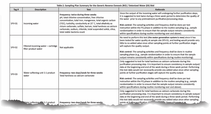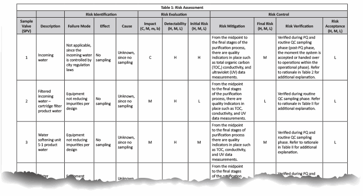 In our case example, there are a total of 21 sampling points in the pretreatment/purified water generation system. The risk assessment indicated in Table 1 was conducted and supported by the rationale in Table 2.