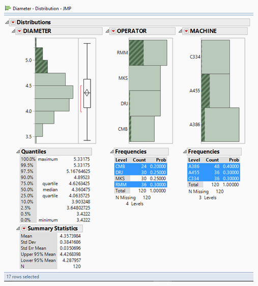 So, what happened to those two averages? Referring to the data table, we see that both high averages were the combination of an operator whose initials are RMM using machine A455. So, is the operator at fault, or was the machine at fault? Let’s use the distribution data and highlight each. First, let’s look at operator RMM in the Phase 1 data only: