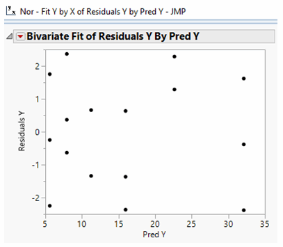 One technique might help separate whether the correlation is happenstance. Residuals are differences between actual data and the results predicted by the model. In this case, does the quadratic model of Y = f(x) actually have some repeatable pattern? So, let’s plot the predicted values of Y to the Residuals of Y correlation to see if a pattern emerges: