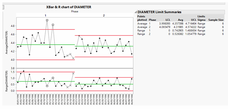 For this example, the JMP sample file Diameter.JMP is used. This data file contains 240 measurements across two phases (ostensibly after an intervention) and four different operators operating three different machines. Only averages of six measurements are plotted. Presumably, the operators and machines are equivalent, but let’s see. Recall that raw materials and machines contribute the most to variability, so in addition to looking at the process performance, we can do further diagnostic work.