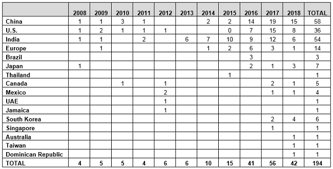 Table 2 and Figure 2 present the number of data integrity-associated warning letters by country over the last 11 years, CY2008 through CY2018, along with a cumulative total. The number of warning letters referencing this topic ranged from four to six from 2008 through 2013 and doubled in CY2014 to 10. The number of warning letters increased from 15 in 2015 to 41 in 2016, and then to 56 in 2017. In 2018, the number actually decreased 25 percent, to 42.