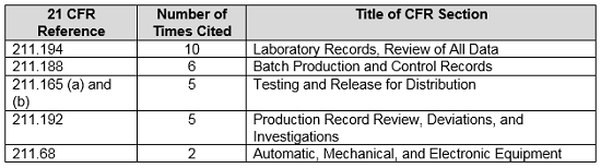 Table 4: Regulations Most Frequently Cited in CY2018 Data Integrity-Associated Drug Warning Letters