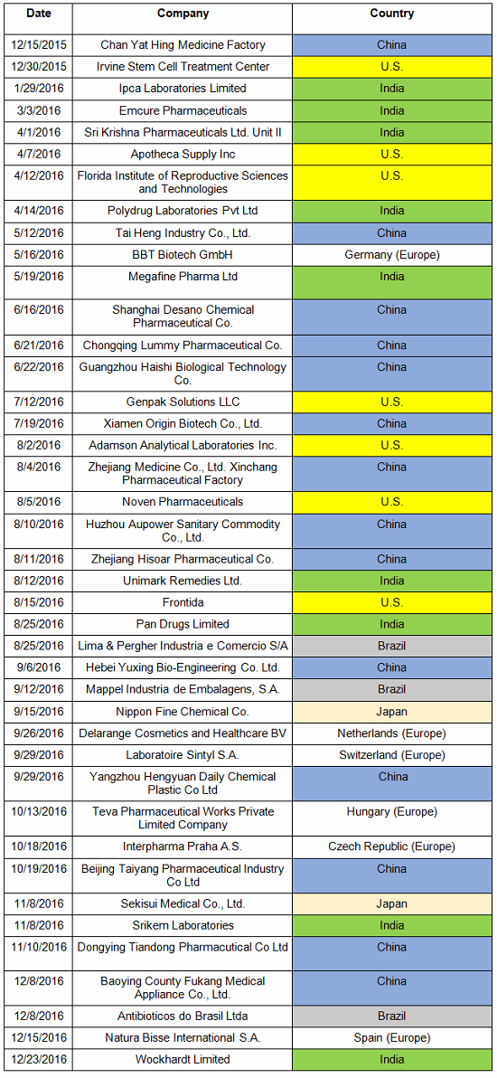Table 1 lists the warning letters that include data integrity deficiencies, the date of issuance, and the country where the facility is located. Note the first two warning letters were from inspections in 2015, but published in 2016 and were not counted in last year’s tally. I’ve color-coded the country column and included all European countries in a single group.