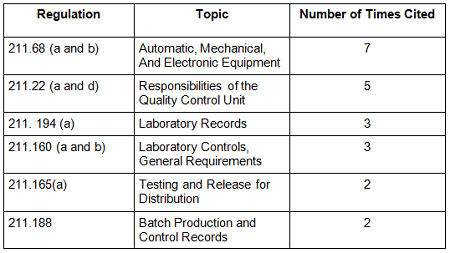 Table 3 shows the regulations cited in the warning letters. Many of the deficiencies identified in the collection for CY2016 did not cite a governing regulation. Many were “conclusions” or “data integrity remediation” instructions from the FDA to which the firm must respond. Many of the letters were issued to API manufacturers and did not cite 21 CFR 211, which applies to finished product. In addition to the regulations cited below, the following regulations were each cited once: 211.100(b), 1271.50(a), 211.165(e), 211.180(e), 211.137(a), 211.180(a), 211.101, 211.186(a), and 211.42(c). As in the past 15-plus years, the FDA has focused on enforcement of the predicate rules.