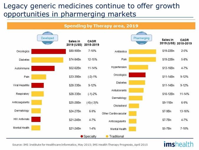 For those companies whose focus has been on small chemical molecules, the “pharmerging” markets continue to offer growth opportunities. In these markets, legacy products for the treatment of infection, pain, cardiovascular disease, and a host of other chronic primary care indications are the foundation of a generic portfolio. This is in contrast to developed markets, where the focus is on speciality areas such as oncology, autoimmune disease, and most recently hepatitis therapies. In developed markets, legacy products are under increasing competition, based on pricing and new clinical alternatives. For the pharmerging markets, affordability and access to medicines are key influencers, and with the expanded availability of clinical support and insurance schemes, we have witnessed new market opportunities open up for these older medicines. Future forecasts reflect a continuing trend, as shown in the table below.