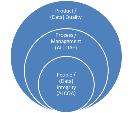 This association of ALCOA, ALCOA+ and overall data and product quality can be theoretically depicted by the diagram below. It shows that the higher the ALCOA and ALCOA+, the higher the overall data quality and product quality.