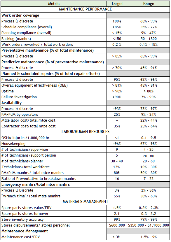 Over the last three decades, the data in Table 1 was collected from different sources, such as large consultancy firms active with the maintenance function at manufacturing companies, large corporations themselves, and personal experience in the maintenance function. These performance metrics are valuable measurements to compare business processes for maturity.