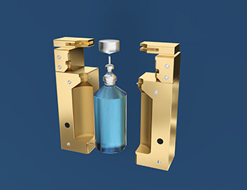 The blow-fill nozzle is lowered into the parison until it forms a seal with the neck of the mold. The container is formed by blowing sterile filtered compressed air into the parison and expanding it against the walls of the integrally cooled mold cavity. Next, the sterile air is vented from the container and the sterile product is metered into the container through the fill nozzle, which then retracts. (Figure c.)