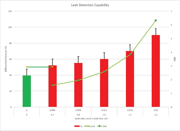 Some vacuum decay systems on the market are extremely sensitive and are capable of detecting leaks as minute as 1 µm, which effectively means a 10 µm, or even a 3-5 µm, detection is done very comfortably and reliably.9 Parenteral applications require this level of sensitivity, with the maximum allowable leakage limit (MALL) being at the single digit micron level to eliminate any risk to the patient.