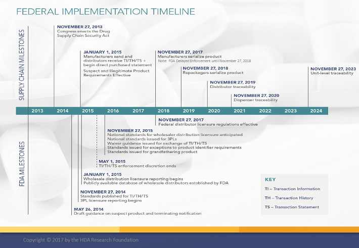 The DSCSA is Title II of the Drug Quality and Security Act (DQSA) that came into force in 2013. The DSCSA defines the implementation model for an interoperable electronic system to authenticate and track marketed prescription drugs in the U.S. By 2023, this will enable serialized traceability for individual packages across the commercial supply chain.