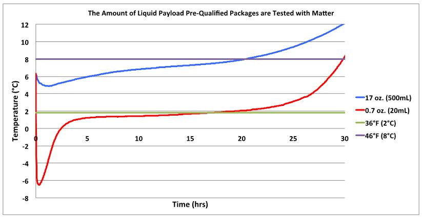 A container qualified for a 17 oz. (500mL) payload will maintain the right temperature but will cause a 0.7 oz. (20mL) payload to freeze |