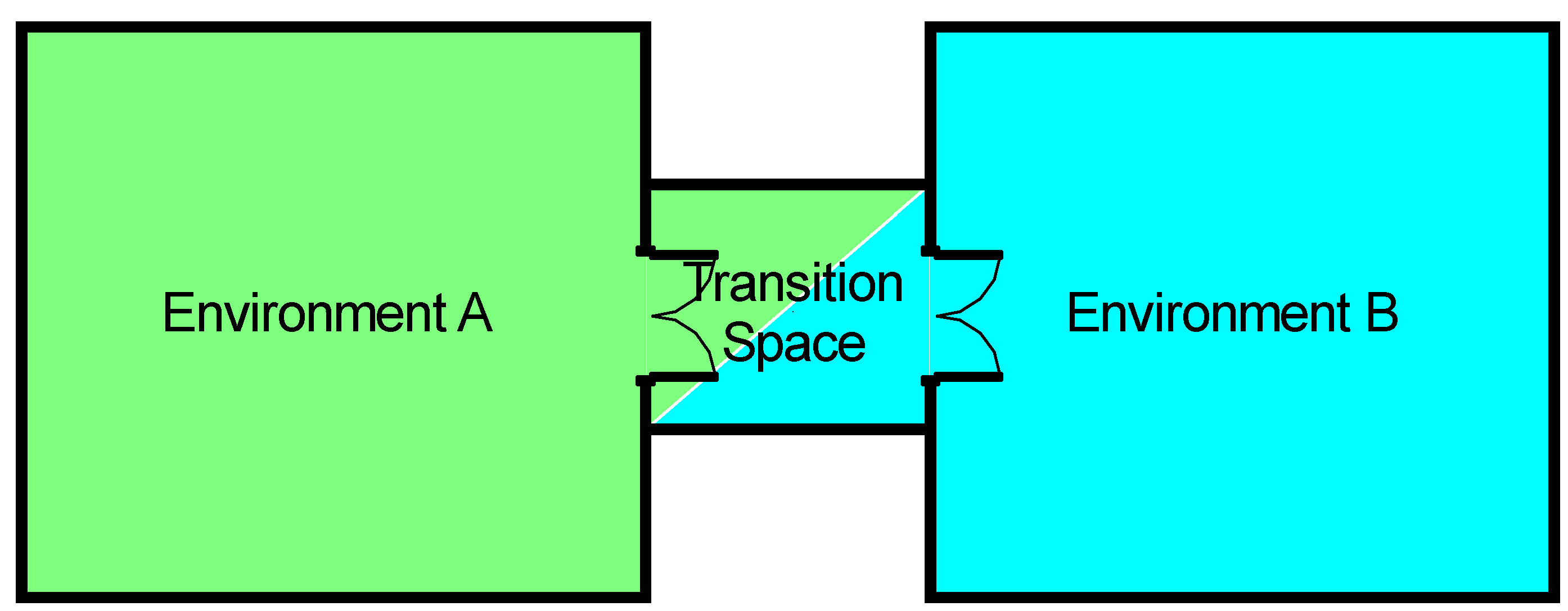 In many types of buildings and areas within them there are disparate conditions. One might be warm, another cold, another noisy, smelly, bright, dark, humid, and so on. If we have little concern for short-term disruptions to these distinct environmental conditions, the areas can simply be directly connected by a door, for example. Should we wish to maintain continuity of a particular set of conditions in one or both adjoining environments, it may be desirable to limit the impact of entry or egress from an area by the use of a transition space. At its most basic, a transition space is a bridge or translator between the two adjacent dissimilar environmental conditions.