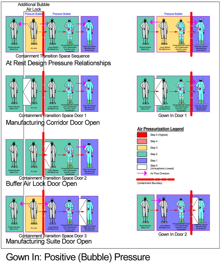 Where concern for containment is elevated due to the nature of manufacturing within the suite, an additional overlayer air lock at the higher air classification of the manufacturing suite may be incorporated. This additional air lock is used to add a buffer layer of controlled pressure, typically a positive, or “bubble,” offering the neutral manufacturing corridor an added layer of protection from the cyclically contaminated gown room or material air lock, while simultaneously maintaining continuous protection to the higher cleanliness of the manufacturing suite. The diagrams below illustrate comparison between the conventional single layer of transition space and the parallel arrangement that incorporates an added buffer air lock. Note in each case the relative location of the containment boundary. Additionally, the air flow comparison indicates that the added buffer air lock results in continuous higher classification air pushed into the manufacturing suite, whereas without it, lower classification manufacturing corridor air is introduced. The buffer air lock allows optimization of both cleanliness and containment criteria simultaneously.