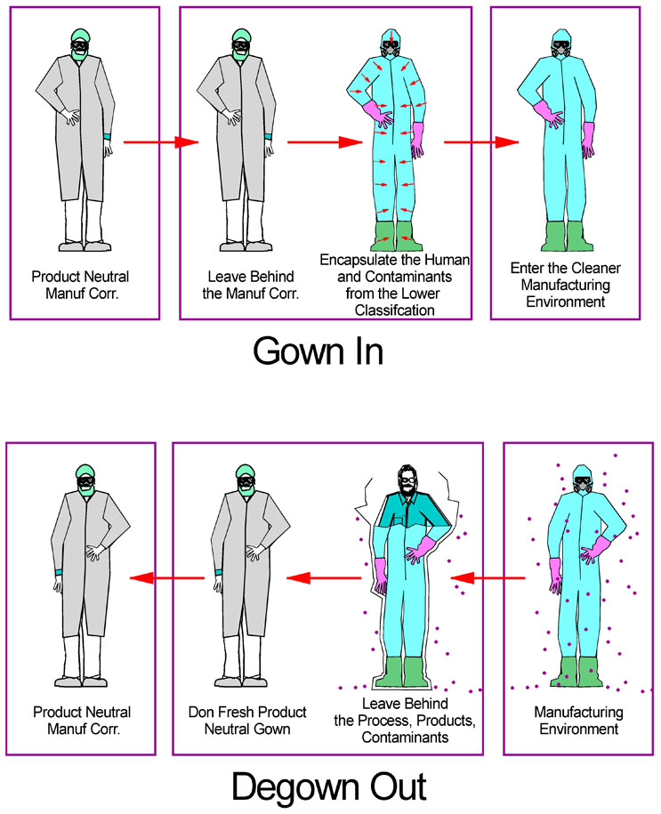 For staff entering a manufacturing area, typically the destination room is at a more stringent cleanliness standard than the arrival environment (often a manufacturing corridor). The diagram below illustrates in general form the transition undertaken. The arriving staff enter the gown room from the lesser classification, dressed appropriately for its conditions and carrying on them accumulated materials and contaminants from the arrival environment. Upon proceeding from the gown room to the destination room they will have donned additional elements of gowning of nature and condition to support the destination’s more stringent environmental conditions. These additional gowning elements also serve to encapsulate the less clean garments and contaminants from the arrival environment, as well as the person themselves. Procedures within the gown room are designed to optimize the performance of this transformation.