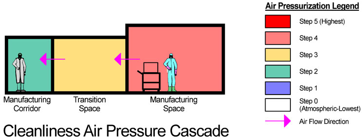 Air pressure is used as a means of accomplishing the primary goals of a transition space. Frequently in service to a higher cleanliness classification, air pressures are maintained to flow outward in a cascade, thereby resisting ingress of contaminants from less clean surrounding environments.