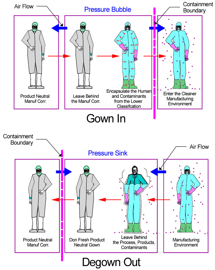 In practice, the need for segregation and containment may drive a gowning step upon entry even if there is no step up in environmental conditions within the manufacturing space. thereby having a layer of gowning present to remove upon egress.