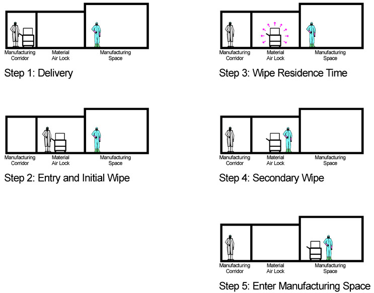 A staff member from the manufacturing space then enters, closes the door, retrieves fresh wipe down supplies and wipes the object a second time. This second wipe down may be needed to remove the residue from the first procedure or to assure clearance of contaminations brought in from the arrival environment (manufacturing corridor) or both. A second residence time may need to elapse, depending on materials in use and company procedure. Finally, the staff member from the manufacturing space withdraws with the object, now prepared for the environmental conditions within.