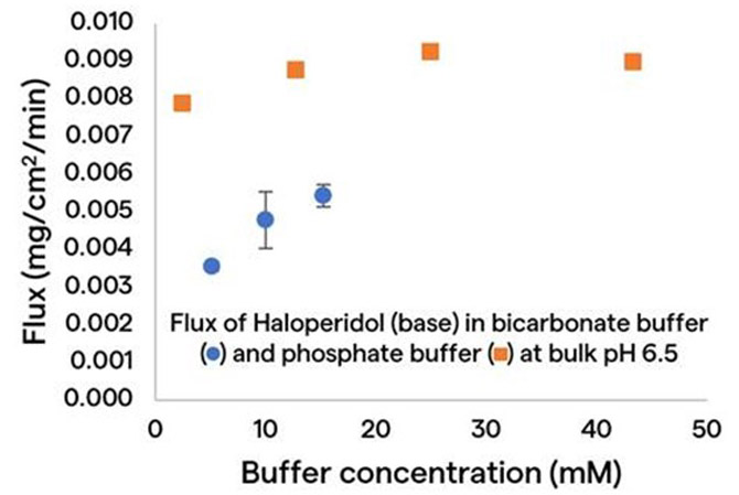 Figure 3 shows flux, which is the surface-area normalized dissolution rate versus the buffer concentration for the weak-base drug Haloperidol, dissolving in a commonly used phosphate buffer (represented by the square data points); and in a bicarbonate buffer (represented by the circle data points).