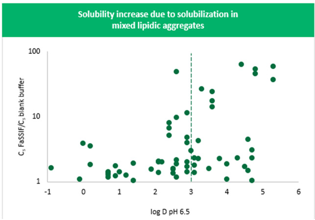 Specifically, this plot shows the solubility in FaSSIF (contains 3 mM of bile salts and 0.75 mM phospholipids) divided by the solubility in a blank medium (does not contain these bile salts or phospholipids) versus drug log D at pH 6.5. The plot indicates a general trend toward an increase in solubilization with an increase in log D at pH 6.5. The solubility increase exceeds a value of 10 when log D is > 3. While the true increase in solubility for a given compound can most accurately be determined by measuring the partition coefficient in the micelles or vesicles themselves, using predicted log D as a surrogate provides a convenient indicator without the need for experimentation.