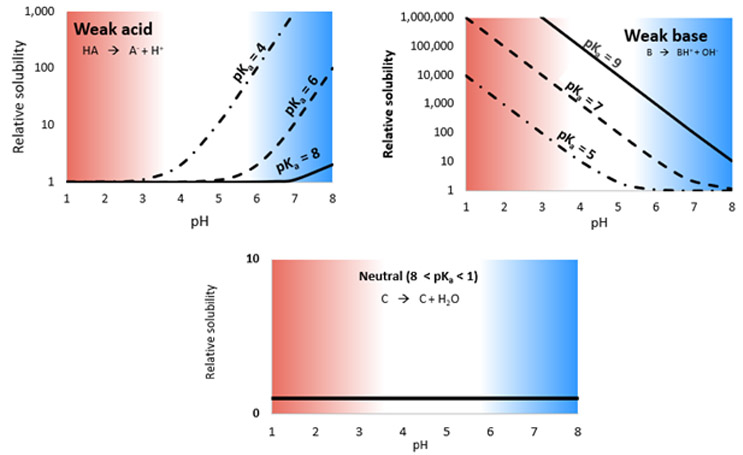 The three graphs in Figure 2 show the relative solubilities of compounds versus fluid pH, according to the Henderson-Hasselbalch equation, where there is an increase in solubility compared to the intrinsic solubility of the molecule as a result of ionization.