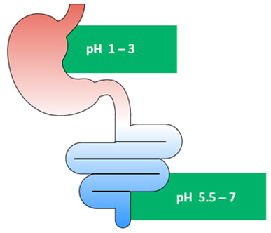In fasted humans, the average pH ranges from about 1 to 3 in the stomach, and it increases to about 5.5 to 7 in the upper small intestine. GI fluid pH can impact solubility (shown as Cs in the equation below) and, therefore, the dissolution rate (represented as dM over dt in the same equation). The acid/base character and pKa of the drug affects the solubility of the drug or excipient at a given pH by impacting the extent of ionization, with a higher degree of ionization resulting in higher solubility.