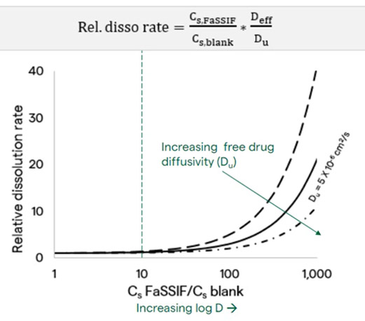 A tenfold increase in solubility results in a minor increase in dissolution rate, and it is not until there is a 100-fold increase in solubility that we see up to a fivefold increase in dissolution rate. This continues to increase as the difference in the solubility goes up. Because a larger than tenfold increase in solubility is typically only seen for drugs with a log D > 3 at pH 6.5 (Figure 6), it can be assumed that when drug log D < 3 at pH 6.5, there would be no appreciable change in dissolution rate.