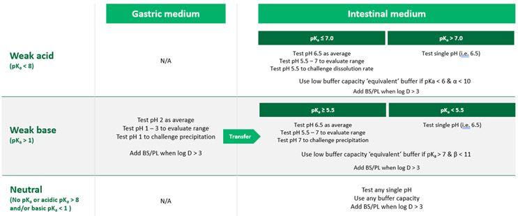 Investigating these concepts provides a basis for choosing pH, buffer species and concentration, and inclusion of bile salts and lipids with the goal of simplifying the media as much as possible while allowing us to achieve physiologically meaningful results. Table 2 is an overall summary of recommendations for selection of the drug/excipient properties listed above.