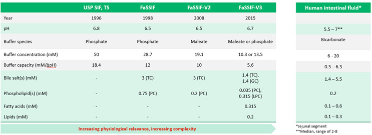 As dissolution testing apparatuses have evolved with our understanding of GI physiology, so too have the dissolution media used during testing. Table 1 below shows the evolution of fluid development to simulate fasted humans, starting with the fluid published by the USP in 1996 and continuing with fluids that became more physiologically relevant and, in some ways, more complex.