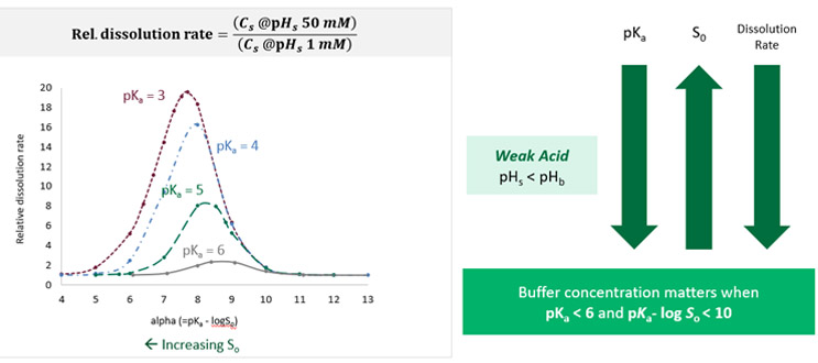 Figure 5 shows that the factors of pKa and intrinsic solubility can be combined to determine when buffer effects are important, using weak acids as an example.