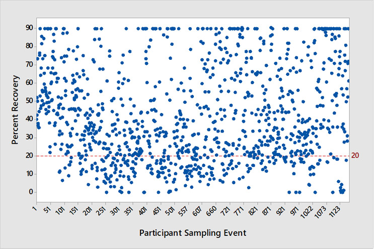 Figure 1. Contact Plate Percent Recovery by Participant Sampling Event. This chart shows the percentage of recoveries by ‘participant sampling event’ for this study (n = 1155). Each data point is the average of 3 microbial-coated test surface replicates. The red line at 20% recovery indicates a recovery efficiency PASS/FAIL threshold that was established based on earlier datasets and contact plate literature.