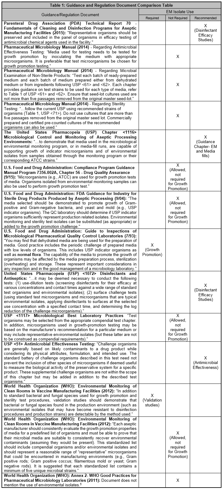 Use of environmental isolates in the pharmaceutical microbiology laboratory has been increasing in popularity, and, in some instances, warning letters have been written for not using environmental isolates in microbiological testing. However, because the available regulations and guidance documents are not clear regarding the use of environmental isolates, opinions vary on how to use them appropriately. This article discusses the current guidance documents, regulatory expectations, and expert opinions on the use of environmental isolates.