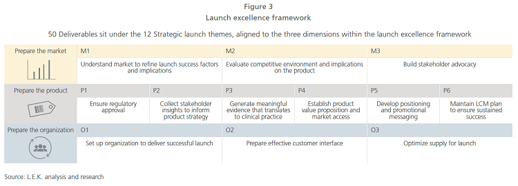 The launch excellence framework depicted in Figure 3 has three main dimensions (market, product, and organization), which cover 12 strategic launch themes with a total of 50 deliverables.