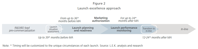 In addition to the early start, biopharmas should implement a well-defined launch excellence approach that guides the process along a clear path from situation assessment to planning and readiness, through to performance monitoring until the brand transitions to “in-line” (see Figure 2 that illustrates both preparation time frames and key planning phases).