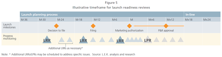 To help participating countries prepare for launch and facilitate collaboration with global representatives, the team should conduct regular in-depth readiness reviews around key milestones such as the decision to file, filing, and marketing authorization. Additional reviews should be scheduled as necessary (see Figure 5).