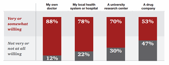 Figure 2: Patients are less likely to share their data with pharmaceutical companies than doctors, hospitals, or researchers.