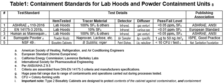 The writer has previously examined this issue1. The following table represents current containment standards used worldwide to evaluate various lab and powder containment equipment in multiple contexts: