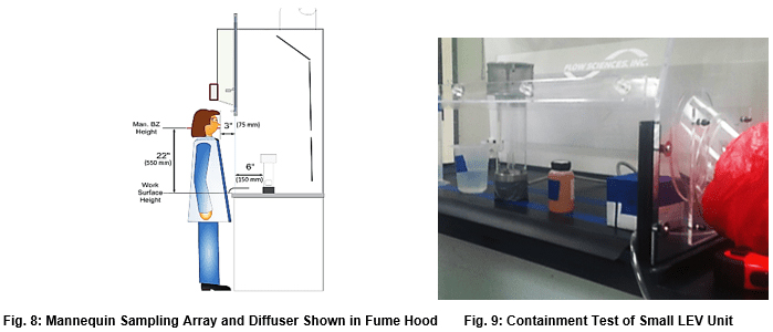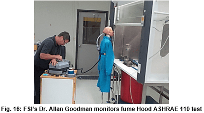 This test uses ASHRAE 110 – specified equipment in a kinetic challenge to the containment cavity. Prescribed manipulation of lab equipment within inches of the operating gas diffuser are undertaken. Containment of tracer gas in the operator’s breathing zone is measured. This test rarely shows containment issues with larger fume hoods, but Flow Sciences also uses this test inside much smaller containment units with similar success. The writer views this test as an aggressive containment evaluation tool because of the programmed movement of objects around the actual tracer gas diffuser. In the writer’s opinion, the test has added an additional kinetic challenge to the tests included in ASHRAE 110.