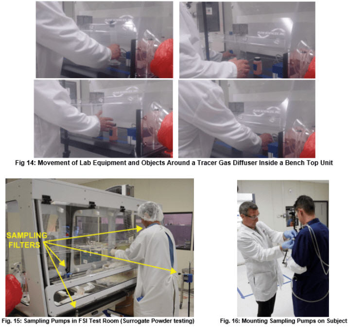 Air pumps and filters collect room and containment area samples during the test procedure. Such pumps are located in the test lab, in the containment device, and on the experimental subjects themselves as in figures 15 and 16 below.