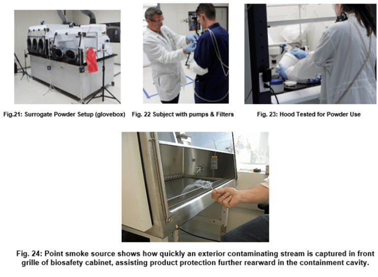 Surrogate powder tests evaluate powder containment and should always be included in any test protocol where finely divided powders are present. Flow Sciences and our clients have insisted on this for years. Powders do not propagate in the same way as tracer gas. Electrostatics can promote containment issues if powders stick to hands and arms inside the containment area and then are withdrawn.