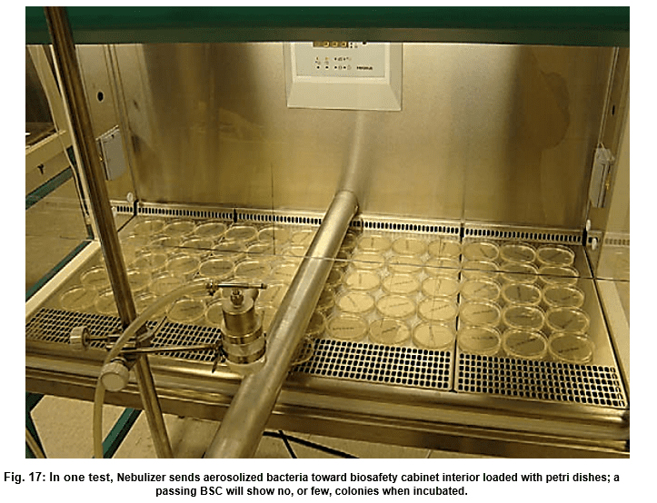In addition, the standard includes detailed test procedures involving nebulized and sprayed Bacillus Subtilis Niger as a representative surrogate bacteria and open agar petri dishes as the detection mechanism. NSF has an internet informational site, including recommendations for installation, field certification tests and decontamination procedures. The NSF website contains a biosafety cabinet index for all approved units, describing all flow metrics that will produce the proper flow to shadow parameters used to certify the original cabinet design 7.