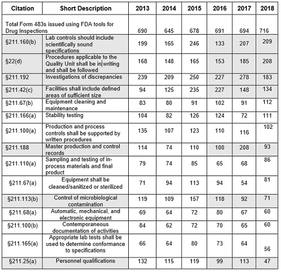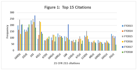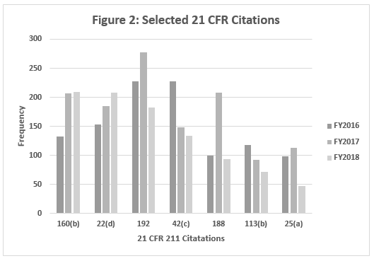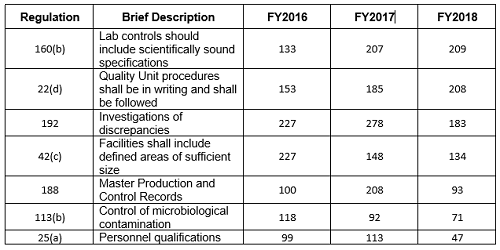 - The two top citations in FY2018, §211.160(b) (Lab controls should include scientifically sound specifications) and §211.22(d) (Quality unit procedures shall be in writing and shall be followed) were previously second and fourth.