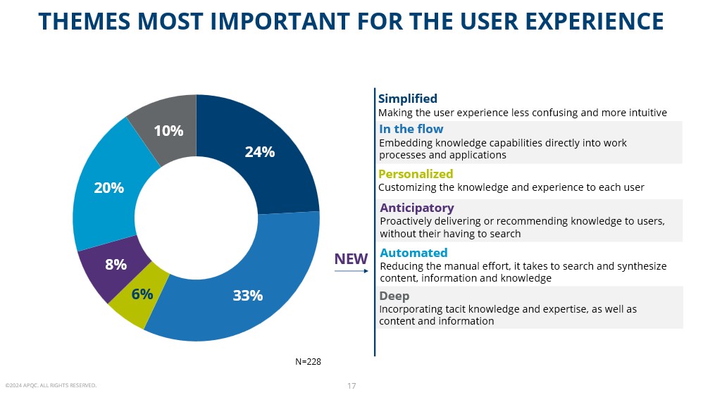 APQC’s research and work shows that organizations are increasingly recognizing the benefits of managing process and knowledge as interconnected entities, rather than separate ones. Data from our 2024 Knowledge Management Priorities and Predictions Survey Report | APQC shows that knowledge users want a better experience, and that building it into processes and applications is critical.
