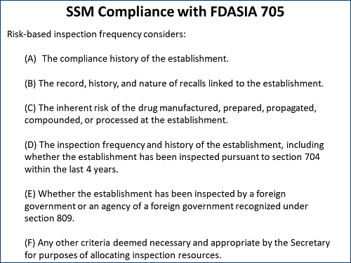 In the past, the agency had a goal of inspecting manufacturing sites every two years. The FDA Safety and Innovation Act (FDASIA), signed into law in 2012, supersedes that requirement. All sites are ranked together based on frequency considerations required by FDASIA.